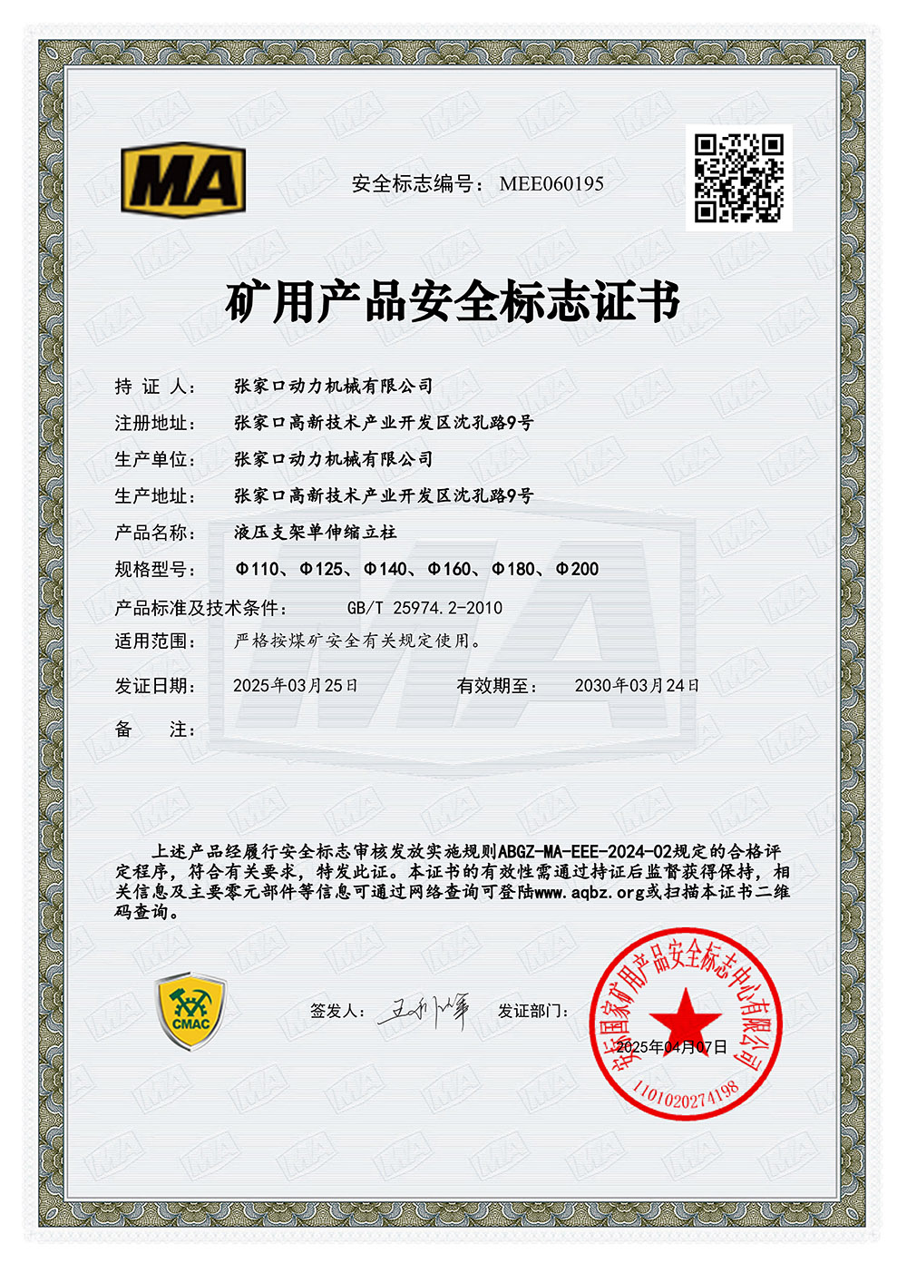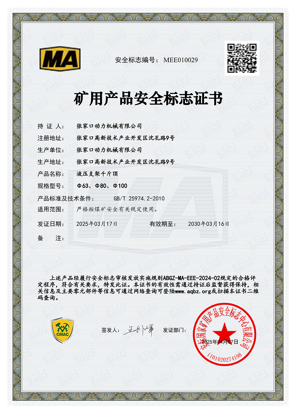 張家口動力機械有限公司生產資質展示