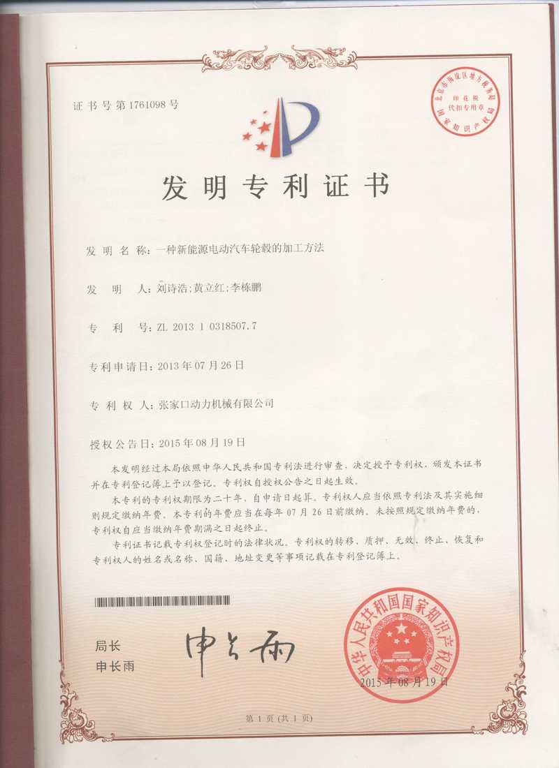 張家口動務(wù)機械有限公司專利證書展示
