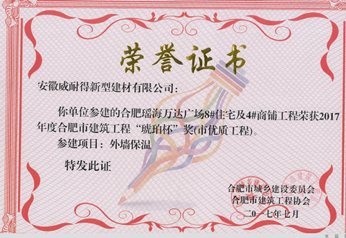 11月25日,安徽威耐得新型建材有限公司收到了合肥市城鄉(xiāng)建設(shè)委員會和合肥市建筑業(yè)協(xié)會寄來的證書,由公司參建的 合肥瑤海萬達廣場 8#住宅及4#商鋪